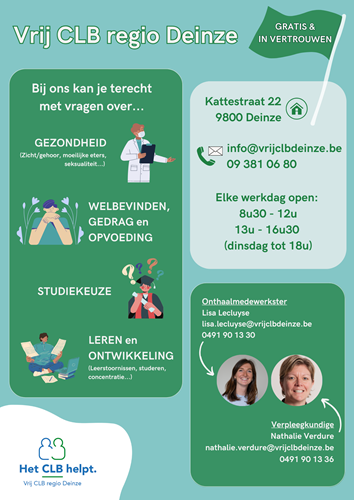 Het ondersteunend team onthaalt jouw vraag als je het algemeen CLB-nummer (09/3810680) riem van een mail stuurt naar het algemeen adres ( info@vclbdeinze.be ).